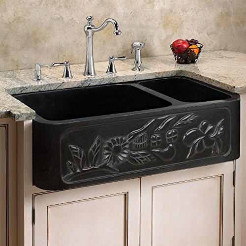 33 Floral 70 30 Offset Double Bowl Polished Granite Farmhouse