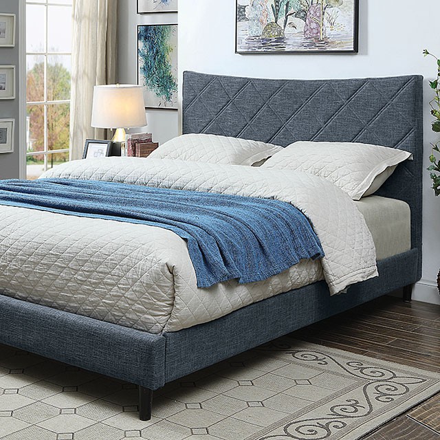 Hs 1pc Queen Size Bed Dark Blue Color Finish Padded Fabric Solid